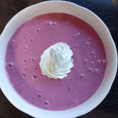 食後のデザート 夏に収穫して、冷凍保存していた・ブラックベリー常備してある・バナナ・牛乳・ヨーグルトブレンダーで混ぜて器へ、・ホイップクリームを絞って簡単にデザート😍😋