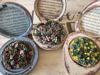 フラワーマーケットでpotsさんのWSで鉢にビーズや石で飾りを付け、寄せ放題で寄せ植えしました☺️お家に帰ってから写真撮りましたはぁ~多肉が紅葉していてかわいいな~💕