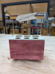 アイスクリームディスプレイ風カトラリーケース 本日は朝から電車、バスをつかって浜松雄踏店でワークショップ。アイスクリームディスプレイ風カトラリーケースを作ってきました。なるべく早くすませたかったので、最速でできた浜松雄踏店でやってきました。結構細かい作業で、ダボの行方不明もありましたが約1時間ほどで出来上がりました。今回は基本に忠実、回として、