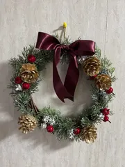 100均のパーツで作ってみました。リボンだけは市販の物でいちばんお金かかってます🤣それなりにクリスマスリースに見えるかな。