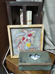 ダイニングテーブルから正面に見えるように飾ってあります☕️一息☕️の時、いつも優雅な気持ちで作品を見ながら☕️タイムです。B・B作る時は、森の中で☕️を飲む イメージしました😍✨しかも、カインズのWSのデビュー作なんです😘ずっと忘れません🤗