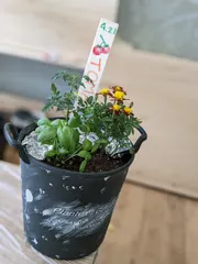 野菜を育てるWS🍅 リニューアルオープンしてDIYコーナーも素敵に生まれ変わっていました✨そこでの初めてのWSはグリーンとのことで、参加してきました🎵 私はミニトマトを選んだので、それに会うコンパニオンプランツであるマリーゴールドとバジルを一緒に。そして板に今日の寄せ植えの記録を✨🍅の絵、満足行くものができま