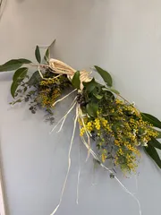 ミモザのスワッグ ミモザWS、続いてはミモザのスワッグでした😊。こちらはリースより簡単✨アシンメトリーになる様に花材を長短二つに分けて束ねるだけ😁束ねた部分を隠すためのラフィアがどうも気に入らなかったので、おうちに帰ってからオーガンジーのリボン🎀を巻いてみました✨どちらがいいかなぁ😊気になっていたお花屋さん、ドライフ