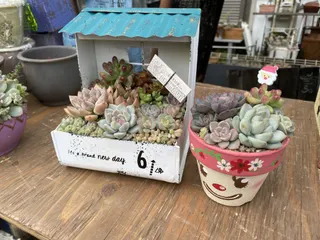 多肉の寄せ植えをしてきました 自宅🏠で多肉の寄せ植えWSをされているところへ、はじめて行ってきました🪴 今回のWSは、鉢の持ち込みがOKだったので、花友フェスタの時に買った鉢を持参して2鉢の寄せ植えしてきました🎶😊🎶 韓国苗以外、いっぱいの多肉がある中、自由に多肉を選んで良かったので、選ぶのに迷いながら、おし
