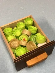 ペットボトルの蓋を使った塗装・乾燥方法 塗装時に「ネコよけ」を使うと<小さなパーツを塗るときなど、とても便利ですよね。ところが、柔らかい材の場合、「ネコよけ」の尖っている部分で傷を付けたり、ニスを塗っている最中に色移りすることがあります。※下の写真、中央。ホワイトになっています。この色が、材に移ることがあります。では、「ネコよけ」に代わる