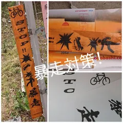 以前の🐗イノシシ注意看板がかなり効果があった(笑)ようでイノシシがいなくなったのだが(住人や施設の方々が一気に伐採)今年になって施設の職員さんたちの自転車が暴走を始めた。4月辺り。そこで看板を作る。↓右がイノシシ看板左が自転車の看板 ↑この狭い道がイノシシ対策できれいになり自転車が車線の多