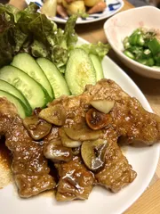 四日市トンテキ ■材料豚ロース厚切りニンニク 2〜3片塩コショウ小麦粉☆ウスターソース 大さじ2☆醤油 小さじ2☆みりん 大さじ1☆砂糖 小さじ1 ■作り方①☆を全て合わせて混ぜておく。②ニンニクの薄皮を剥き、厚めの薄切りにする。③豚肉を筋切りして、叩いて グローブのように切れ目を入れて塩コショウして、う