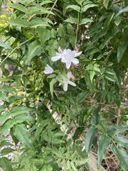ジャスミンの開花 今朝 玄関出たら開花してました。15年位たつのですが毎年開花している訳ではなく、今年は過去最高になりそうです。開花と共に香りもするのですねー😊 しばらく楽しめそうです👍