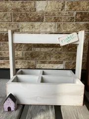ガーデントレイ🌱 オフホワイトのペンキに茶色のアクリル絵の具で古びた感じにして、ミニ看板を付けてみました^ ^前後違う感じに仕上げています。
