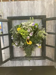 季節のハンギングバスケット ボリュームがあって、色々なグリーンも使い、とても素敵なハンギングになりました。葉牡丹やパンジー、ビオラなど、落ち着いた品のある豪華なハンギングです。これから、春まで楽しみです。