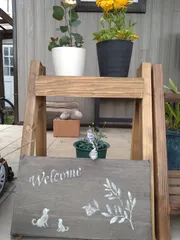 アレンジアワード2022「看板付き鉢置きスタンド」リメイク 以前WSで作ったものを看板取り付けずに持ち帰り、看板がかえられるようにフックを逆さにして差し込み式にしました。もとあった看板の裏側にもステンシルして両面仕様に。そして下の段にも鉢が置けるようにすのこを置きました。