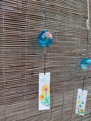 絵付け風鈴 キッズワークショップの風鈴づくりに参加してきました。花火を三面に描きました、短冊には裏表にひまわりと朝顔を描いて風でくるくるしても大丈夫!絵を描くのも久しぶり!私は花火友達はスマイル!たのしいひとときでした。