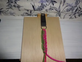 もっともっと簡単その16 1番 簡単な編み方です。 ↓ 縦が軸 15~20cm程。横は編み用 緑と赤(各1m)はライタ-で温め接着してあります。 図の様に通します。 締めると こうなります。 A図 ↓ 緑から 図の様に通します。