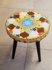 コラベルスツール タイルワークショップで今度はコラベルスツールを作りました。前回と同じ様にまずタイルを選び、デザインを考えて並べて置いて、マスキングテープをして目地入れをしました。花のタイルとコラベルタイルをカットするのが難しかったです😅今回の目地は、イエローにしました✨細かい作業があったりで、5時間かかって完成しま