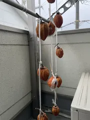 我が家の干し柿 職場の先輩から頂いた柿で、初めて干し柿挑戦中です(^ν^) 干してから約1週間は、たちました。美味しくできるといいな(o^^o)