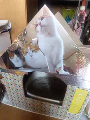 猫トイレハウス 完成! 塗料使うのは諦めて(もったいないから?) その代わり、スマホに撮りためた猫たちの写真をコンビニプリント、屋根に看板様に取り付けて(透明テープでカバーしただけです)キラキラマステで隙間を飾り付け、 あーぁ雑な性格が作品と写真に表れてるなァ~ 拡大して見ないこと!アラが……