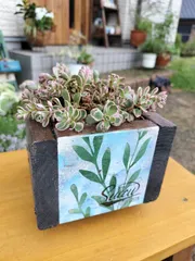 B&B ステンシルコースター2枚でリバーシブルミニプランターを作りました😆端材を利用してます。上から。水抜きの穴も。下から。足を付けて空気の通り道。内側と上下面は超撥水塗料を塗っています。ステンシルも追加🤭 先日購入したコーカサスキリンソウ トリカラーを入れてみました🥰大きさ比較。