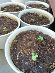 ビオラちゃん、植え替えてみました。🌱🌱🌱🌱 ビオラ苗、1番最初に植えた子の一部を6号鉢に植え替えてみました。育苗トレイ卒業早すぎるかも❓❓❓本葉出てるし、後続のビオラもいっぱいなので試し掘りならぬ試し植えです。ゼオライト、マグァンプDも混ぜ込んで、芽出しの土より良い環境を提供出来たと思うのですが、無謀かな? 頑張れビオラ苗、自宅産な