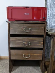 キッチンシェルフですが… 昨日ワークショップで、作りました。今日引き取りに行ったときに、取手を付けたいと相談すると、工房で付け方を教えてくれて、その場で、仕上げることが出来ました!!以前作ったキッズデスク&チェアーと合わせて、パソコン作業をするスペースが出来ました〜ちなみにこの取手は、カインズの商品で、取手部分の出っ張りが気