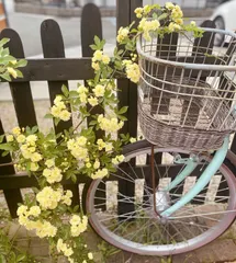 庭のモッコウバラ🌸🌼 庭が狭いので、毎年強剪定してますが、無事に開花しました。この時期の芝桜との共演がお気に入り🌸🌼錆びてきた娘の古い自転車🚲絡んでいい感じになるかなぁ☺️