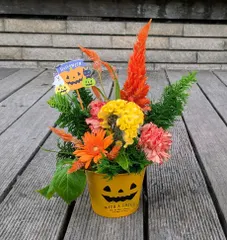 ワンコインフラワーアレンジ(お祭り⑤) こちらも先日のお祭りイベントです💐以前よりお花も値上がりしている昨今💦かわいいピックまでついてワンコイン‼️フラワーアレンジの経験はほぼゼロなので、ベースのお花は先生のお手本と一緒にしました😊細長いオレンジのケイトウがかわいいなぁ💕