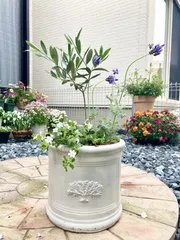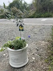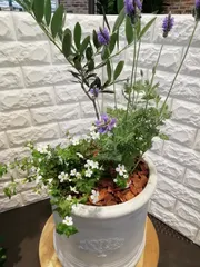 シンボルツリーの寄せ植え オリーブとレースラベンダーとバコパを入れています。大きくなるのが楽しみです。オリーブは違う種類の2本植えないと🫒実がならないそうです。