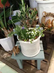 シンボルツリーの寄せ植え シンボルツリー寄せ植えに参加して来ました❗オリーブとバコパとラベンダーの3つをとても素敵な鉢に植え込みます参加の皆さん手際よく植えていかれるのに向きとか位置とか決まらず最後になってしまいちょっと焦りましたが時間内に植え込みできました❗オリーブも種類があって迷いましたが葉っぱの形が丸っこいこにしました