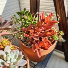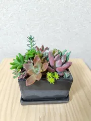 多肉の寄せ植え ■作品内容先日イベントで、「鉢」購入者は多肉植物寄せ植え無料に惹かれて、渋めの四角い「鉢」を購入しました🤗■工夫ポイントお店の方に「まだまだ入るよ」と言われながら色々な種類の多肉植物達を寄せ植えしました。でも、下手くそすぎて多肉植物達がポロポロ落ちる~🥲どうにか落ち着かせ連れ帰って来ました。それでも