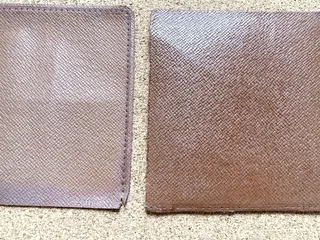 古くなったLV財布のリメイク 2. ずっと引き出しに眠っていた夫の古いLVの財布をリメイクします 元の財布 まずはバラして裁断から…2枚に切りました今回はコチラを使います 内側ボロボロお恥ずかしい🙈余りは アイデアが生まれるまで温存しておきます内張りを染め直しました 右は▶︎染め直し後今