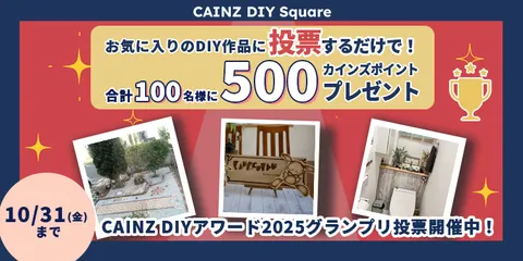 CAINZ DIYアワード2025 グランプリ投票開催 「CAINZ DIY アワード2025」へ多数のご投稿をいただきました!みなさまありがとうございました✨その中で、「くらしに、ららら。部門」のご投稿より、運営にて10作品を選出しました!カインズ商品を使用した選りすぐりのDIY作品が集結しております✨10作品の中からグランプリを選ぶ「グランプリ投票」