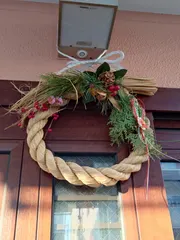 玄関飾りを作ってみました 玄関飾りを作って今年2年目。しめ縄を作り、輪にまとめ、庭の南天と松、100円ショップの飾りを着けて今年は綺麗に作れました。わらを綺麗になうのが難しいですが、年々上手になってきました😅