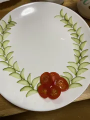 お皿に飾り付け きゅうりとミニトマトをカットして、お皿をデコレーションしてみました。真ん中に🍤エビフライを乗せて、いつもと違う雰囲気に。