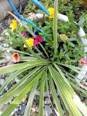 アレンジアワード2023【偽物アンブレラ型プランターの寄せ植え】 GWSでアンブレラ型プランターに寄せ植え、喉から手が出るほど欲しい!ステキな作品!だけどポーチュラカは売るほど増えてる?! ハンギングプランターのヒモが切れてゴミに出していた母親から「いいもの見(め)っけ!」ともらい受け、鉢底穴にハンガーを引っ掛けました!土を入れ、観葉植物の葉物を一株、ハ