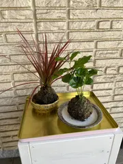 苔玉ワークショップ🍀 GWSで観葉植物の苔玉作りしてきました🍀観葉植物はアイビー、アスパラ、ゴムの木、シダ系、椰子の木風の植物(名前忘れました😅)など色んな種類から選べました❣️周りの水苔がポロポロ落ちやすくて、テグスで上手く抑えながら巻くのに時間がかかりましたが、何とか完成😊 写真左はドラセナのレインボー、右