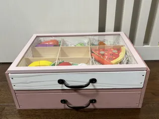 今までのワークショップをヒントに おままごとに夢中な姪っ子「ほんとは木で出来てるものがいいんやろうけどこっちには売ってないし…」と母から聞き、色んな100均で調達したものに、無謀にも入れ物を作ることに💦ちょうどアンティーク風小物収納ボックスのWSに参加した頃だったので、作り方を参考にして作り始めて数ヶ月💦ノコギリが下手なので切り直し