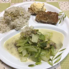 鶏肉を炒めて、塩・胡椒、そしてパセリをふりかけました。外側はカリカリです。隣の卵は業務スーパーのもの。このままパンに盛れば、タマゴサンドの出来上がりです。 下の料理は、貝+キャベツ+塩・胡椒+バター、そしてポッカのレモンで味付けしました。(はじめて使ったときは、減塩を謳っている商品なので、