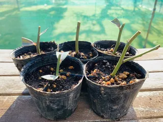 ブルーベリーの花芽調整した際に切った枝の中で活きが良さそうな枝を挿し木にしました。(品種:ブライトウェル) ブルーベリーはけっこう強くて、挿し木にしても成功率高いです。 去年はじめて挿し木をしてみたんですがうまく行って成功率50%くらいかなと思って多めにやったら90%以上の成功率