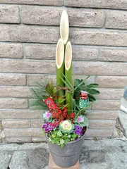 毎年恒例の門松🎍作り 毎年、近所の友達と年末恒例の門松作りを楽しみます😊と言っても、葉牡丹の寄せ植えに竹を突き刺しただけの簡単なものなので雰囲気があればオッケー👌というアバウトな門松🎍です🤣 昨日、近くの森に南天や松、笹などを取りに行って来ました。家の横の空き地から切ってきた竹の斜めカットが一番難しく、大事なポ