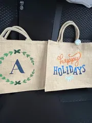 B Bジュートバッグ ジュートバッグを二つ作ってきました!ぽんぽんと何でも入っちゃうサイズで、ショッピングバックとして使おうかな…イニシャルの方は娘にあげようと思います😉