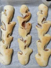 ベーコンエピ ホームベーカリーで生地作り切りこみ入れて(めちゃ下手くそ🤣🤣)二次発酵後⬇️完成!外はパリパリ✌堅すぎず食べやすい😋😋