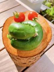 初めてにして駆け込みの投稿です。 手探りのプランター菜園、初めて収穫できたへそ曲りきゅうりとミニトマト、置いてみたら何とも憎めない顔になりました。 買った方が断然安いのでは!?な収穫量ですが、家族で楽しんでいます。