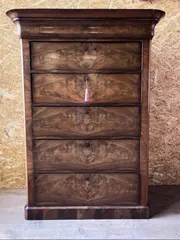 アンティーク マホガニーの箪笥 私が思い描くマホガニーはこのタイプ。保護のため塗ってしまっているベッドと後から同じオーナーさんが譲ってくれたマホガニーのナイトテーブルは、100年超えであまり手入れがされていなかったため、塗装しましたが本来はこのタイプでした。 扉が襲ってきた、あのクローゼットとベッドとナイトテーブルは推定