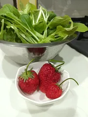🔰完熟苺を収穫しました。 大阪しろなとミックスレタス、真っ赤な🍓を収穫しました。完熟の目安がわからなくて、いっぱい待ちました。種の色が…とか聞いたような。ちゃんと中まで赤くなる種類だったのですね。「完熟🍓を収穫して食べる😋」夢が叶って嬉しいです。とってもいい香り。無茶甘とかでは無いけど、苺らしい味。\(^o^)/