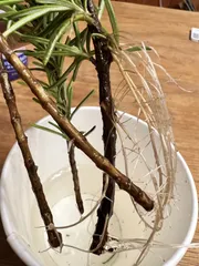 ローズマリー発根 先日、職場のメンズ看護師にたくさん頂いたローズマリーを少しだけカップで水揚げしていました。さっき、ふと見ると根っこボーボー出てました😊もうそろそろ植えても大丈夫そうですね♡