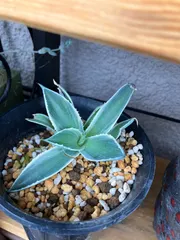 真っ白でふにゃふにゃした子株をいただき、サボテン用の土に載せて、日に当てると焼けてしまうので、日陰に置いて、久しぶりに見たらこんな感じに色づいてました。何にもしてないが、アガベが自分から親と同じ姿に!凄いびっくりしました。