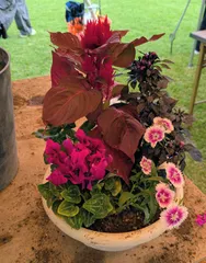 ワンコイン寄せ植え(お祭り④) こちらもお祭りイベントです✨ワンコインで5苗を寄せ植えできるという素晴らしいイベント‼️鉢底石はなかったけど、土と鉢付きで500円‼️花材は選べませんが、ハロウィンをイメージした赤いケイトウと紫の観賞用の唐辛子が入っています✨紫の観賞用唐辛子がすごくハロウィンっぽい色合いです💜🎃