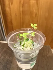 この後はどうしたら🤔 我が家のスタバカップの水耕栽培の三つ葉☘️さん。なんとも頼りなげで今にも萎れそうなんですけど💦栄養?それとも日光?土に植えた方がいいのかしら?