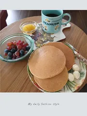 朝ごはん(手作りジャムとパンケーキ♪) 小さなガラス皿に入ってるのは、メロン、冷凍白葡萄、蜂蜜、柚子の皮を煮詰めたフルーツジャムです♡パンケーキの生地にはオリーブオイルを混ぜ合わせています😋♪