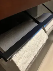 これもDIY⁈ 我が家のお気に入りのトイレットペーパーフォルダーですが、切れ味が悪い。特にペーパーが減ってくるとさらに切れ味が悪い。これが毎回のストレス!!(トイレットペーパーホルダー自体はDIYではありません)ということで、どこのご家庭にもある食品用ラップの刃を幅に合わせてハサミで切って、両面テープで貼り付け。ま