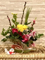 ひな祭り🎎のアレンジメント 菜の花,桃,麦の穂の入ったアレンジメントです。オアシスが菱餅になっていました。